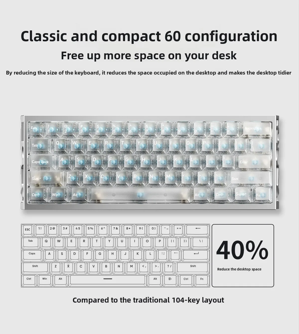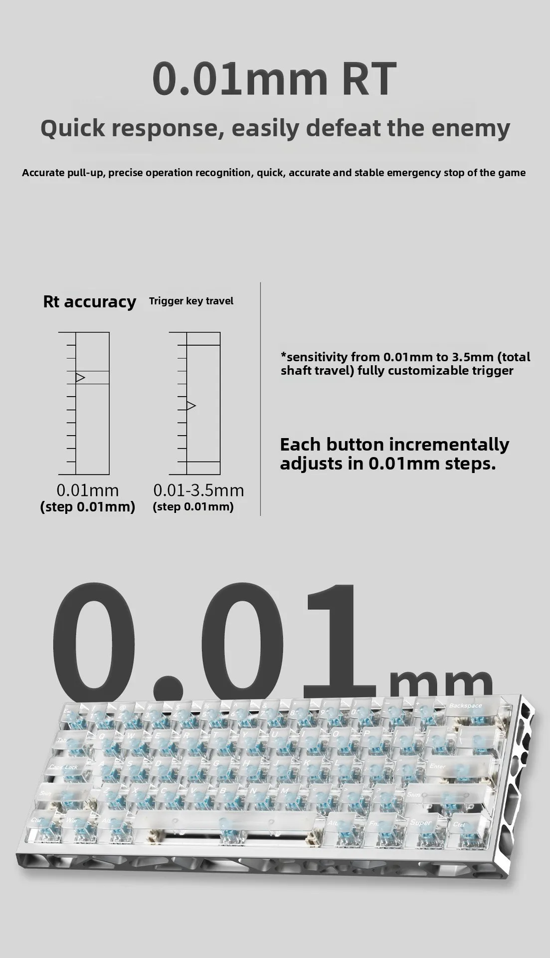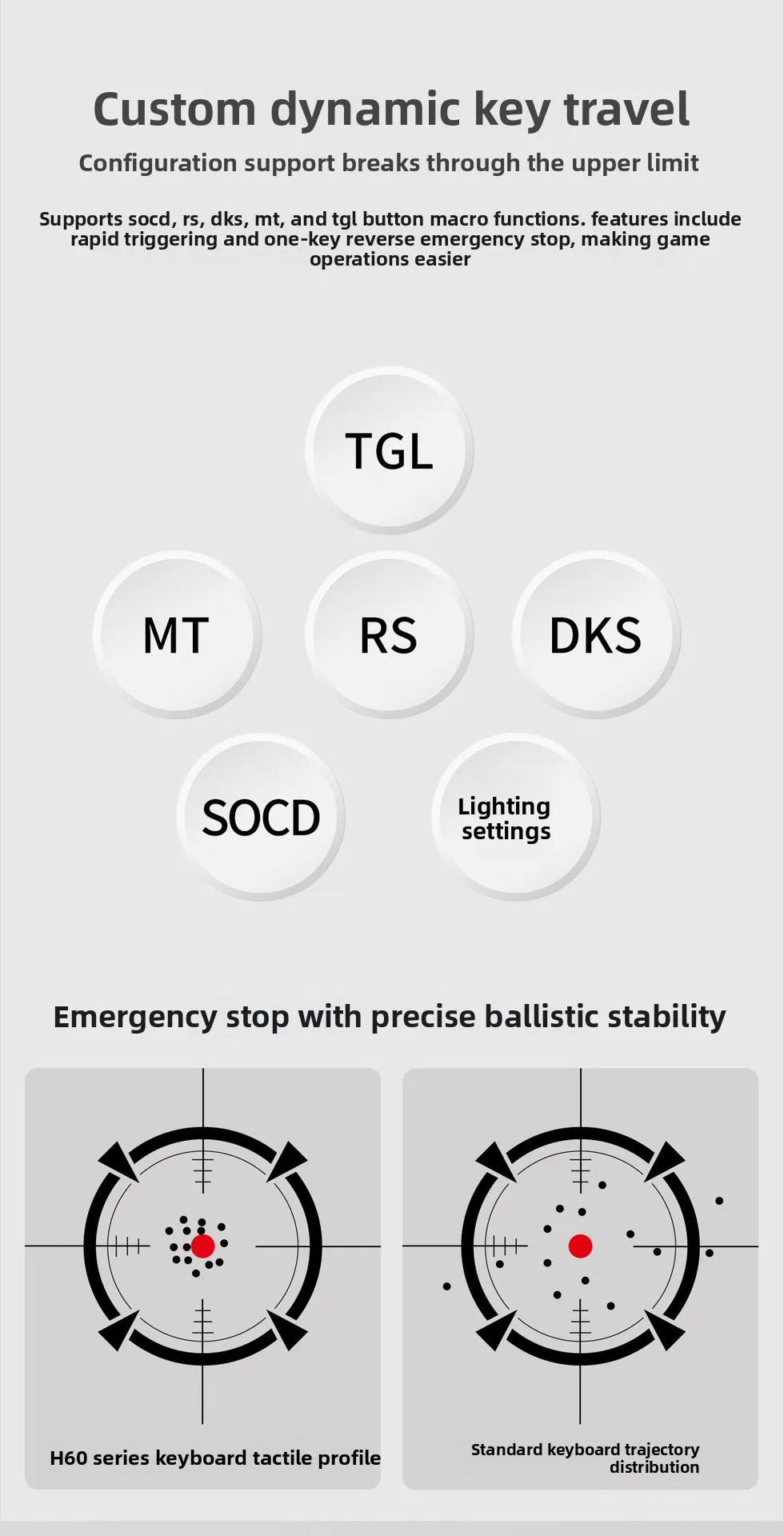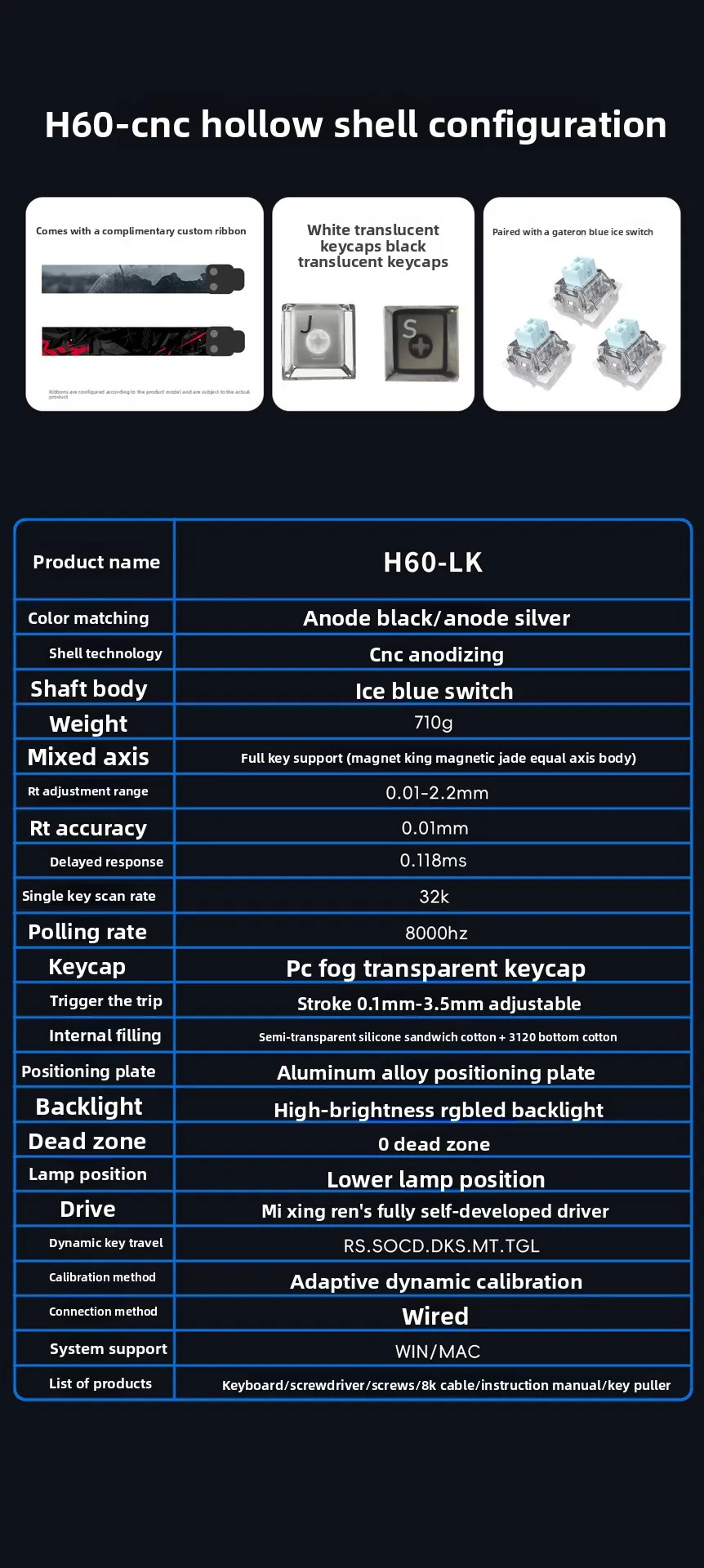 Experience next-level gaming with our wired mechanical gaming keyboard, designed specifically for esports enthusiasts and casual gamers alike. Featuring a sleek 61-key compact layout, this keyboard is perfect for saving space on your setup while delivering powerful performance (Model: 29310329MM). Weighing just 536.8g, it's lightweight and portable, making it an excellent choice for gamers on the go, Equipped with high-performance Hejin magnetic switches, this keyboard provides ultra-fast trigger and reset capabilities. With adjustable key travel ranging from 0.1 to 2.3mm, you can customize your typing experience to match your unique gaming style. The fully hot-swappable switches allow for effortless personalization, so you can easily upgrade or change your switches based on your preferences, Durability is key, and our PBT five-sided dye-sublimated keycaps resist wear and oil buildup, ensuring long-lasting clarity and a premium feel. Enjoy esports-grade low latency and full N-key rollover for precise, responsive gameplay, giving you a competitive edge, Enhance your gaming atmosphere with built-in RGB backlighting, featuring 16 million customizable colors for a truly immersive experience. The strategically placed bottom LED illuminates your setup, while internal sound-dampening cotton minimizes noise for a quieter environment, Designed for compatibility, our keyboard connects seamlessly via a 1.5m Type-C cable, supporting both Windows and Mac systems for plug-and-play convenience. Take control with customizable macros and driver settings, plus OEM services available for tailored solutions, Elevate your gaming experience with a perfect blend of performance, durability, and personalization. This wired mechanical gaming keyboard is your ultimate gaming companion, whether you're competing at the highest level or enjoying casual gameplay